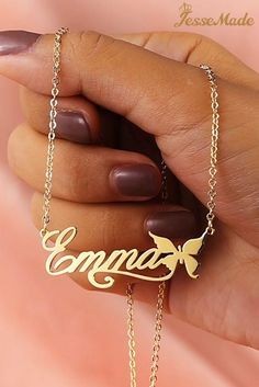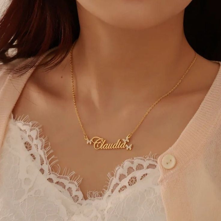 Material: High-quality stainless steel with a durable gold-plated finish, featuring a personalized name pendant with a butterfly design.